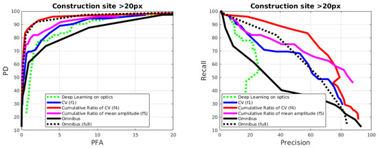 Case of construction site detection of size > 20 px (Saclay site, France) PD/PFA performances—Precision/recall.