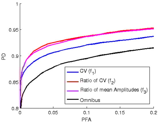 We have selected all of the pixels belonging to one single boat without superposition, those that are represented in gray in Figure 11. The statistical distributions of the three criteria , , , and the criterion of the Omnibus method, where computed for all the pixels belonging to the boats, and then for pixels of a sea area. We can then use these distributions to compute the ROC curve, by deriving the True positive Rate and False positive Rate for different threshold values. Figure 12 presents the resulting ROC curves.