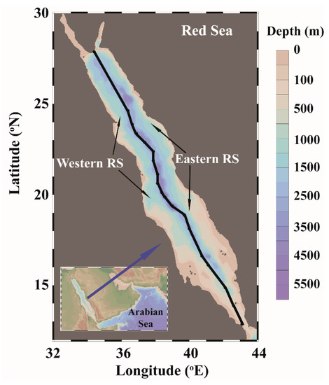 The geographical location and the bathymetry of the study area. The eastern and western Red Sea is marked and is separated using an axial line (black line) passing through the approximate middle of the Red Sea.