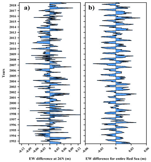 The spatial and temporal variability of the sea level in the Red Sea is analyzed based on satellite altimetry records for the period from 1993 to 2018. Apart from the previously documented findings [11,17,19], the analysis has shown an interesting pattern of the east–west difference in the sea level between the eastern and western sides of the Red Sea, which is seen in all years and has significant seasonal variability. The spatial and temporal variability of this east–west difference (hereafter “EW difference”) is investigated to understand the short-term and long-term variability based on SLA derived from satellite altimetry records from 1993 to 2018 (26 years).