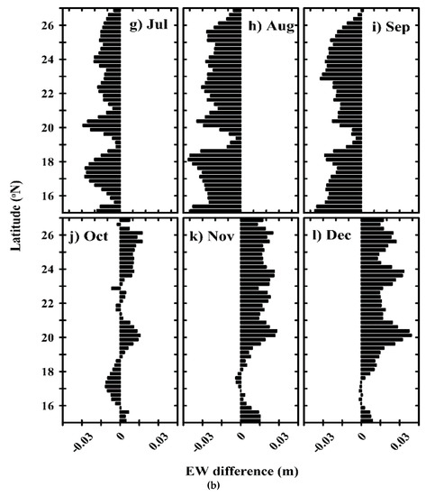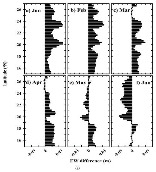 The monthly climatology of EW difference is prepared for each latitude for every 0.25°, which shows that the EW difference exists from the north to the south of the Red Sea (Figure 3a,b). We considered the region between 15°N & 27°N to remove the Gulf of Suez, the Gulf of Aqaba, and the Bab al Mandab strait from the calculation. The climatology shows that the sea level in the eastern Red Sea is clearly higher than that of the western region during January and February in the entire basin, but the pattern exists in at least 70% of the basin from November to April. Similarly, the western side is visibly higher than the eastern side from July to September. The months of May–June and October display a mixed pattern of the EW differences. In both transition periods, winter to summer and summer to winter, the reversal was first observed in the northern Red Sea. We have also noticed that the summer peak of the sea level in the western region is slightly higher (0.3 cm on average) than that of winter peak in the eastern region.
