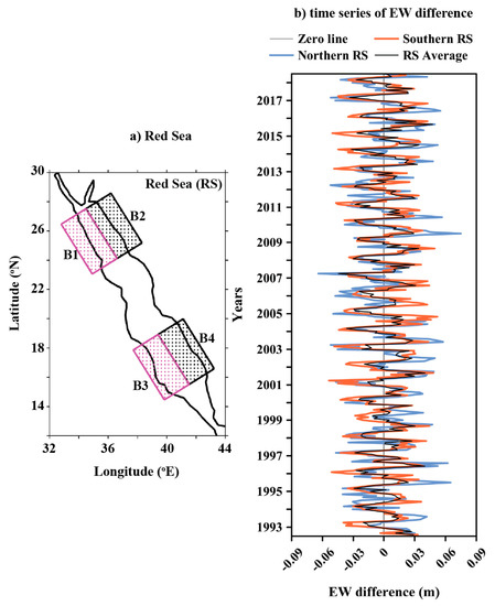 The EW differences are estimated for the data points that fall into the boxes named B1 (northwestern), B2 (northeastern), B3 (southwestern), and B4 (southeastern), as shown in Figure 5a. The EW difference in sea level for the northern and southern Red Sea is shown in Figure 5b. The variability in both the northern and southern Red Sea are in phase; however, a small difference can be observed in the amplitude of variability.