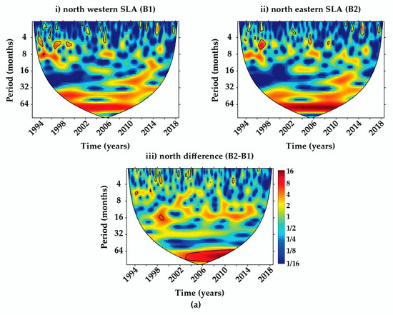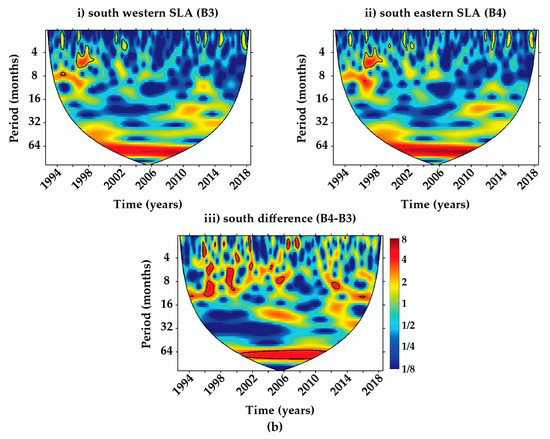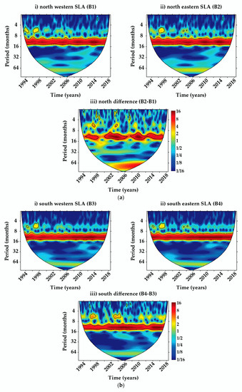 The wavelet plots after removing the annual signals for the western basin, eastern basin, and their difference (a) for the northern Red Sea and (b) for the southern Red Sea.