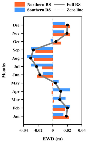 In brief, a significant seasonally reversing EW difference pattern exists in the Red Sea. The average annual cycle of EW difference for the northern, southern, and whole basin of the Red Sea is shown in Figure 8. On average, the eastern side is higher than the western side from November to March and vice versa from June to September (Figure 8), indicating that the eastern side has a higher sea level for a period twice as long (8 months) as the western side (4 months).