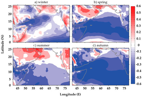 The spatial correlations of zonal winds in the Arabian Sea and MEI are shown in Figure 9, which illustrates that the ENSO remotely influences the EW difference the sea level of the Red Sea by regulating the flow of surface water into the Red Sea from the Arabian Sea. An enhanced easterly wind can intensify the surface inflow of the Arabian Sea water to the Red Sea [26].