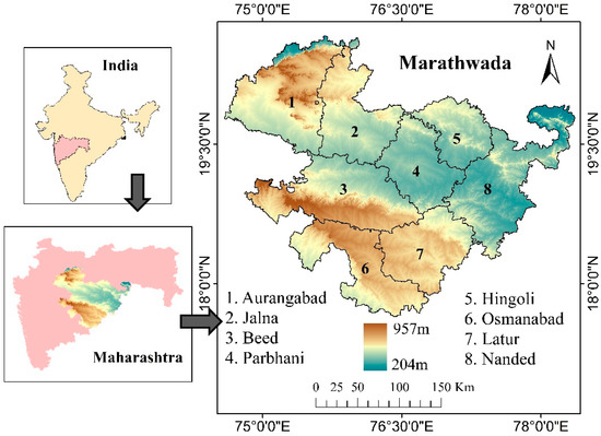 43]. Administratively, the Marathwada region is known as the ‘Aurangabad’ division of Maharashtra state, which consists of eight districts, named as Osmanabad, Jalna, Parbhani, Nanded, Aurangabad, Beed, Hingoli, and Latur. The geographical latitudinal expansion of Marathwada is 17°35′N to 20°41′N, and the longitudinal extent is 74°40′E to 78°16′E (