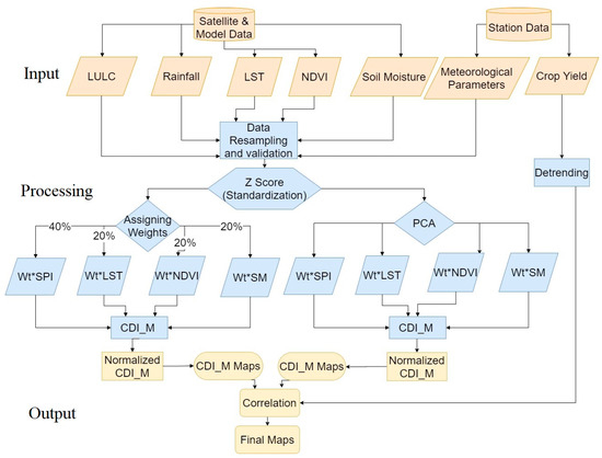 In this study, four primary drought indicator parameters (i.e., LST, SPI, NDVI, and SM) that are representing mainly the agricultural-field conditions (SM and NDVI), meteorological (SPI), and land atmospheric interaction (LST) were used to develop the combined drought index for Marathwada (CDI_M). Two approaches were also tested to combine these input parameters: (1) an expert judgment method (fixed weights, based on in-situ relationships and expert knowledge) and (2) a statistical (PCA) method. For the first time in India, the PCA technique is implemented through this study for the region-specific development of CDI. Previously, this approach was used by Hazaymeh and Hassan [