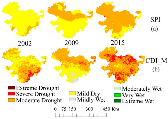 Figure 7b). The individual SPI technique was able to identify the drought conditions at some extent, but CDI_M gives the more detailed and precise nature of expanses of drought (