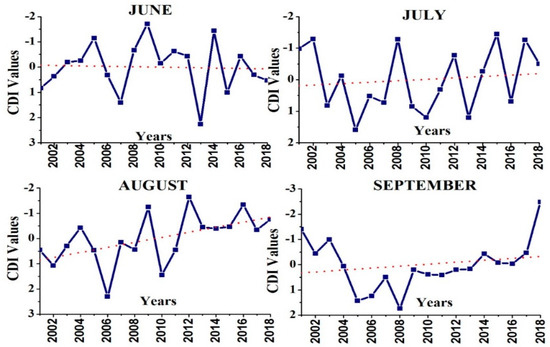 Figure 8. This figure exhibits the increasing trend in CDI_M values during July, August, and September. The CDI_M values range from −2 to +2. Lower values of CDI_M (negative) indicate the drier nature of a surface. Therefore, upward trends in the CDI_M inferred the increasing drought intensities from 2001 to 2018 in Marathwada. The enhanced drought stress is more pronounced in August and July, which are the primary sowing months for the Kharif crops. Other than monsoon months, an increasing trend in CDI_M values was also noticed during February, April, and October within the study area.
