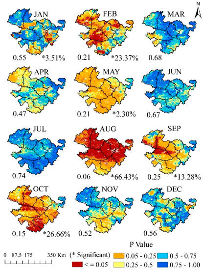 Figure 10 represents the monthly spatial spread of statistical significance (P values) of the CDI_M values with respect to years. In August, 66.4% of Marathwada noticed a significantly increasing trend (p ≤ 0.05, hence, accepted the alternative hypothesis, i.e., drought intensities are increasing with respect to time) in CDI_M intensities, followed by October (26.7% area, where p ≤ 0.05), February (23.4% area, where p ≤ 0.05), and September (13.3% area, where p ≤ 0.05) (