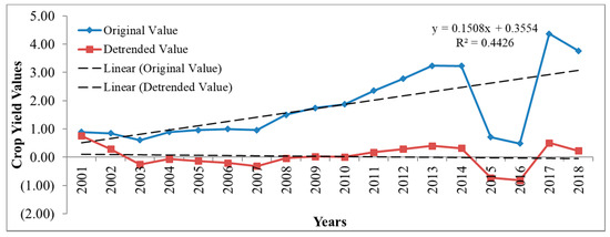 66]. Intense dry spells in India always have a dire influence on the community and environment. Marathwada agriculture sector, in particular, bears 80% of the direct impacts of severe drought events. Therefore, in the present research, we have tried to comprehend the spatio-temporal association between major crop yields and cropping season drought incidences. To reduce the influence of other non-agro-climatological parameters on crop production, all the crop yield datasets were detrended, as shown in