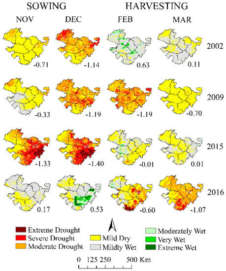 Figure 12 represents the spatio-temporal patterns of dry spells in the highly-affected drought years for Marathwada. In the Rabi season, most of the sowing and harvesting months experience mild to extreme drought conditions over the years 2002, 2009, and 2015–16. For the sowing months, in particular, the Nanded, Parbhani, and Hingoli districts have noticed the highest intensity dry spells. During the harvesting months, perhaps due to some local factors such as irrigation, only a few small areas of extremely dry pockets (Osmanabad, Parbhani) and equal distribution of mild wet and mild dry spells were detected over most regions of Marathwada.