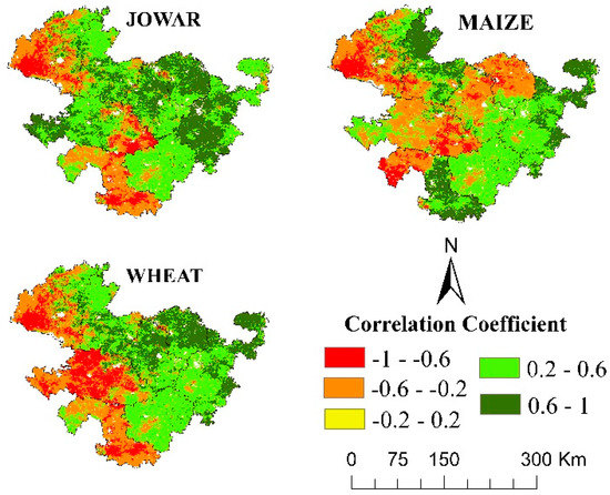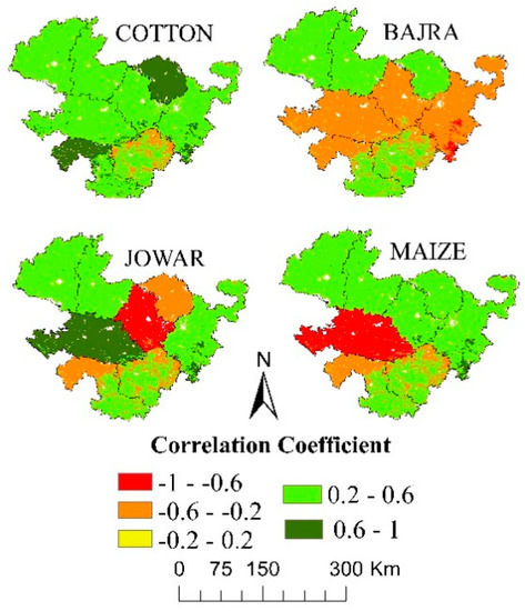 Figure 15). In the case of cotton, the entire Hingoli and northern horn of Osmanabad districts observed a significant correlation (r > 0.7) between crop yield and drought intensities (
