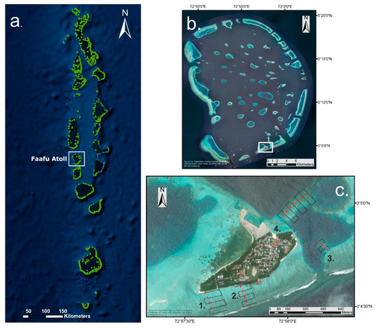 (a) Geographic location of the study area, Republic of Maldives; (b) Faafu Atoll. (c) The four monitored reef areas around Magoodhoo island: black dotted lines indicate the approximate extent of the UAV-surveyed areas and the flight paths; red dashed lines indicate the snorkeling transects.