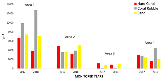 The benthic assemblage maps realized from the OBIA analysis define the coverage of hard coral, coral rubble and sand in selected portions of the four monitored areas a few months after the 2016 bleaching events and more than two years later (Figure 4c,c’). The comparison of the maps revealed a general loss in the extent of hard coral framework coverage, precisely 11–15% of the total mapped area, with a total loss of 6119 m2 (Figure 5). Regarding the other two classes, we noticed an increase in coral rubble (a class closely linked to the degradation and fragmentation of the coral colonies) in Area 1, Area 2 and Area 4, the area most affected by the reduction in hard coral.