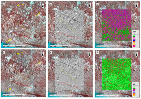 A portion of orthomosaic and DTM of Area 4 monitored in February 2017 (a–c) and November 2018 (d–f). Hillshade DTM comparison (b–e) highlights an overall flattening of the area due to the destruction of coral colonies, mainly Acropora table colonies, indicated by the yellow arrows (for a close-range view, see Figure 11. Colored lines in (a–d) and (b–e) represent selected transects in which linear rugosity and average slope have been computed (see the text for an explanation and Table 3). (c,f) Images representing the rugosity maps of the area around transects.