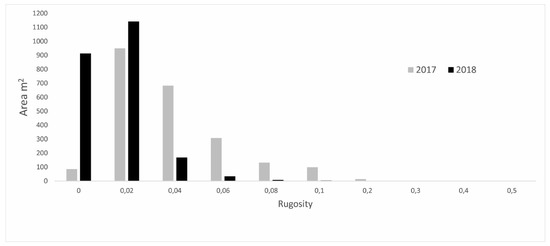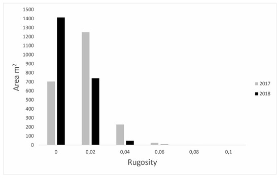 The histogram describes the temporal change (from 2017 to 2018) in the extent of areas with the same rugosity index in the selected portion of Area 2 (Figure 8).