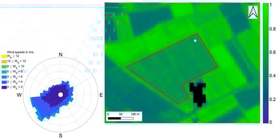 Normalized Difference Vegetation Index (NDVI) Sentinel-2 image of the short-rotation coppice (SRC) plantation in Lochristi acquired on 7 July 2016, at 10 m resolution. The red polygon is the area of the plantation. The same area was extracted for calculating VIs. The white dot indicates the location of the flux tower. The black pixels represent the outbuildings. On the left, the wind rose for 2016 representing the wind direction distribution for wind speed classes.