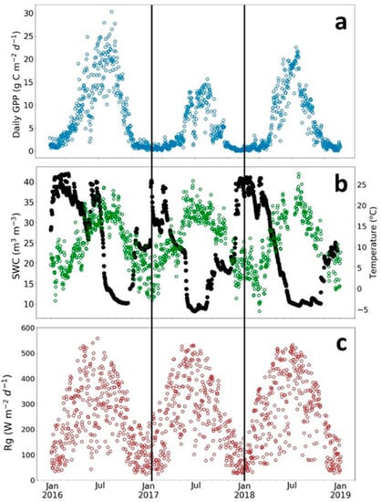 GPP was estimated from the measured NEE by partitioning it into its two main components: GPP and ecosystem respiration , following the well-established relationship , where Reco is modeled from NEE night-time data as a function of measured air temperature [80,81]. The full time-series of the three variables have been obtained by filling unavoidable gaps in the measured NEE time-series, using the methodology for gap-filling and partitioning described by Reichstein et al. (2005). Numerical results were obtained using the REddyProc online tool provided by the Max Planck Institute (https://www.bgc-jena.mpg.de/bgi/index.php/Services/REddyProcWeb). We averaged half-hourly GPP values between 10:00 and 14:00 solar local time to allow for direct comparison with the Sentinel-2 satellite data acquisition. These values are indicated hereafter as GPP, while daily sums of GPP are indicated as daily GPP.