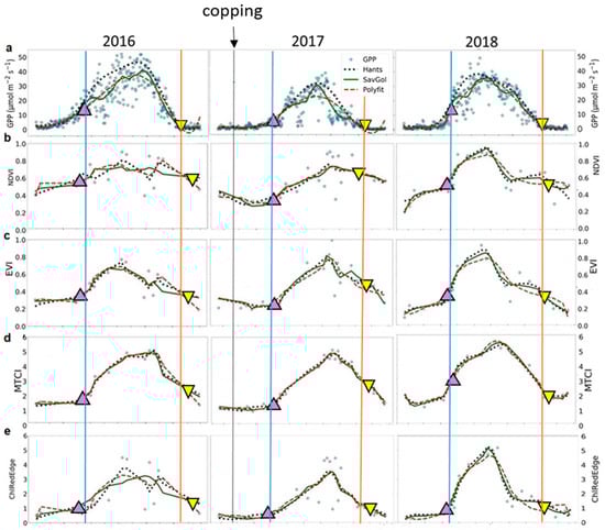 Finally, a correlation analysis was performed to investigate the relationship between GPP and VIs. This analysis allowed us to understand if the coppicing in 2017 and drought in 2018 have an effect on the VI−GPP relationships and which VI can explain better this effect. We assumed the existence of a strong linear relationship between VIs and GPP as reported for different ecosystems [44,58]. Furthermore, this analysis was performed using original, not fitted, time-series data of both GPP and VIs to exclude the effect of filtering methods on the VI−GPP relationship. The goodness of the linear model was tested by the following statistics: the coefficient of determination (R2) and root mean square error (RMSE).