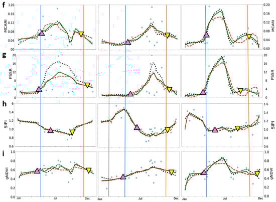 Time-series of the seasonal variation of midday Gross Primary Productivity (GPP) and vegetation indices derived from Sentinel-2 images. (a) GPP (in μmol m−2 s−1); (b) NDVI—Normalized Difference Vegetation Index; (c) EVI—Enhanced Vegetation Index; (d) MTCI—MERIS Terrestrial Chlorophyll Index; and (e) ChlRedEdge—Chlorophyll red-edge; (f) MCARI—Modified Chlorophyll Absorption Ratio Index; (g) PSSR—Pigment Specific Simple Ratio; (h) SIPI—Structure Insensitive Pigment Index; (i) gNDVI—Green Normalized Difference Vegetation Index. Blue circles represent original data; dotted black lines represent HANTS series fitted data; green lines Savitzky–Golay (SavGol) series fitted data; and dashed red lines polynomial (Polyfit) series fitted data. Up-pointing pink and down-pointing yellow triangles represent mean values, in days, of the start and the end of season, respectively, derived from filtering methods. Blue and orange lines indicate the start and the end of season of GPP, respectively.