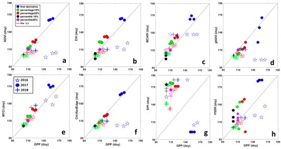 Relationship between the start of the season (SOS), in days, derived from Gross Primary Productivity (GPP) and different vegetation indices. (a) NDVI—Normalized Difference Vegetation Index; (b) EVI—Enhanced Vegetation Index; (c) MCARI—Modified Chlorophyll Absorption Ratio Index; (d) gNDVI—Green Normalized Difference Vegetation Index; (e) MTCI—MERIS Terrestrial Chlorophyll Index; (f) ChlRedEdge—Chlorophyll red-edge; (g) SIPI—Structure Insensitive Pigment Index; and (h) PSSR—Pigment Specific Simple Ratio. Different colors represent different methods for deriving SOS: blue = first derivative method; green = percentage 10%; red = percentage 20%; black = percentile 10%; pink = percentile 20%. Symbols show different years: stars (☆) are for 2016; circles (●) for 2017 and plus (+) for 2018.