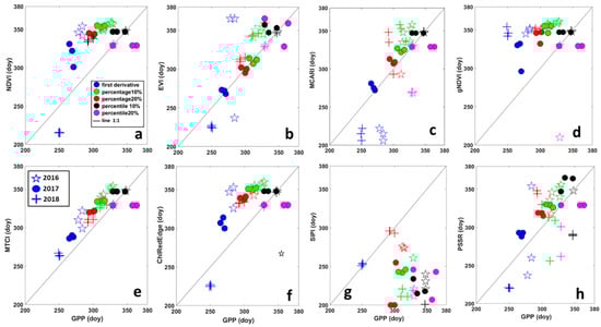 Relationship between the end of the season (EOS), in days, derived from Gross Primary Productivity (GPP) and different vegetation indices. (a) NDVI—Normalized Difference Vegetation Index; (b) EVI—Enhanced Vegetation Index; (c) MCARI—Modified Chlorophyll Absorption Ratio Index; (d) gNDVI—Green Normalized Difference Vegetation Index; (e) MTCI—MERIS Terrestrial Chlorophyll Index; (f) ChlRedEdge—Chlorophyll red-edge; (g) SIPI—Structure Insensitive Pigment Index; and (h) PSSR—Pigment Specific Simple Ratio. Different colors represent different methods for deriving SOS: blue = first derivative method; green = percentage 10%; red = percentage 20%; black = percentile 10%; pink = percentile 20%. Symbols show different years: stars (☆) are for 2016; circles (●) for 2017 and plus (+) for 2018.