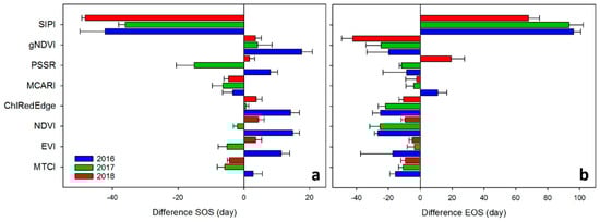 Difference, in days, between phonological metrics derived from Gross Primary Productivity (GPP) and VIs (see VIs definitions in Table 1) for each year averaged for filtering methods. (a) SOS—start of season; (b) EOS—end of season. Error bars represent the standard deviation between the filtering method estimates.