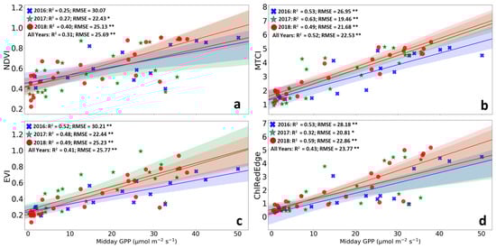 Linear correlation between Gross Primary Productivity (GPP) and the vegetation indices. (a) NDVI—Normalized Vegetation Difference Index (NDVI); (b) EVI—Enhanced Vegetation Index; (c) MTCI—MERIS Terrestrial Chlorophyll Index; and (d) ChlRedEdge—chlorophyll red-edge index. The blue, green and red dots represent 2016, 2017 and 2018, respectively. The lines represent the linear fitted models. The shaded areas represent the 95% confidence intervals for the slopes of the fitted lines. R2, coefficient of determination; RMSE, root mean square error; * 0.01 < p ≤ 0.05; ** p ≤ 0.01.