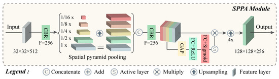 Enlarging receptive fields and extracting multiscale features can help obtain more global context information. Recently, many practices have tried these two aspects and some useful network structure solutions have been proposed. For example, global convolution network (GCNet) [58] adopts a “large kernel” to enlarge the receptive field, PSPNet utilizes a spatial pyramid pooling (SPP) module to obtain a multiscale pooling feature [55], and DeepLab [62] proposes atrous spatial pyramid pooling to capture the context information of different receptive fields. Inspired by PSPNet, we introduced an SPPA module that combines the advantages of SPP and channelwise attention. As shown in Figure 3, the features of the final stage output of the backbone network with a size of 1/8 of the original image were connected to a CBR block, and the number of channel dimensions was reduced to 256. A spatial pyramid pooling (SPP) submodule was applied to capture the context information from different scales. The SPP consisted of five average pooling layers, with kernel and stride sizes of 1 × 1, 2 × 2, 4 × 4, 8 × 8, and 16 × 16 respectively. Then, we directly upsampled all five pyramid level layers to 1/8 of the original image, and then concatenated them. Before being fed into the next channelwise attention block, the feature combination was reduced by a 1 × 1 Conv. In the attention block, the spatial information from all the channels was squeezed by average pooling and output as a one-dimensional vector of size 1 × 1 × C. Followed by two 1 × 1 Conv and one active layer, the computed weight vector was able to reweight the feature and control feature selection. After upsampling by a factor of 4, the output of the SPPA module was a feature map with 1/2 the size of the input image.