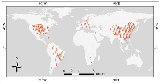More than 1600 scenes of GF-5 RGB images with a size of 2008 × 2083 were collected on a global scale, covering the period from January to March 2019. Some scenes with invalid data were eliminated, and the rest of the images were further selected according to the land-cover types and cloud coverage to ensure that the model could be applied to common scenarios. A collection of images containing typical scenarios was chosen to evaluate the visual performance of the prediction results, and the remaining 717 scenes (Figure 6) were used for model training and quantitative evaluation. The scenes contained multiple collections such as cloudy, sunny, snow, cloud and snow coexisting, etc., covering common scenarios such as cities, mountains, forests, farmland, etc. All selected images were manually labeled with reference cloud masks (RCMs). In the first stage, the threshold-based method with careful thresholding was used to label the cloud, and in the second stage, the mask results were visually checked and corrected, especially for complex samples with snow or ice. The RGB images and the RCMs together formed a four-band dataset.