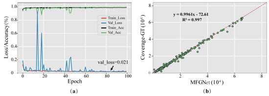 Diagram for evaluation model training on the validation set: (a) The loss and accuracy curve for the MFGNet; (b) The RCM plotted against the predicted cloud coverage for the MFGNet.