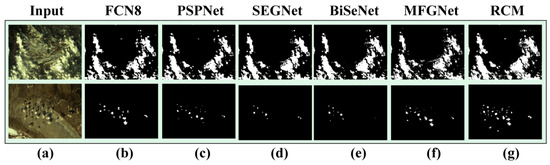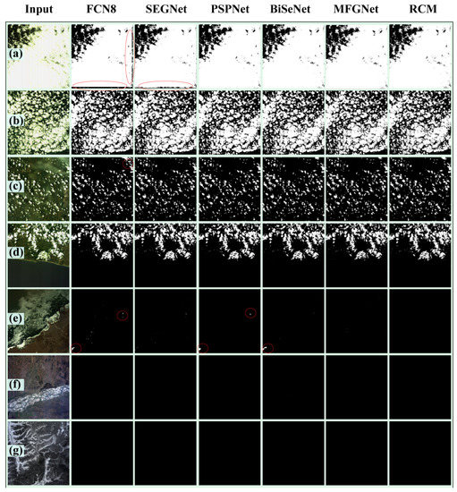 Comparison of cloud segmentation of CNN-based methods in the presence of cloud and ice. (a–d) are for cloud-only cases, and (e–g) are for ice and snow coexisting cases. All sizes of RGB images are 2008 × 2083. Abbreviations: RCM, reference cloud mask.