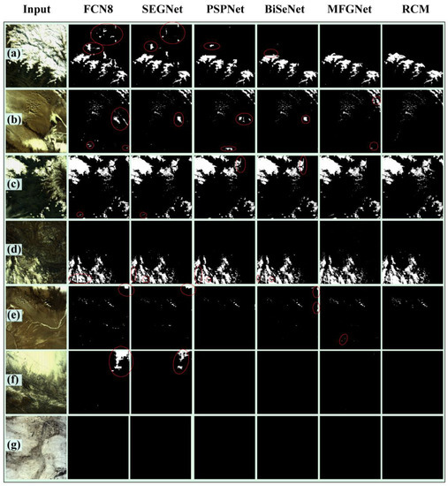 Comparison of cloud segmentation of CNN-based methods in the presence of cloud and snow. (a–e) are for cloud and snow coexisting cases, and (f,g) are for snow-only cases. All sizes of RGB images are 2008 × 2083.