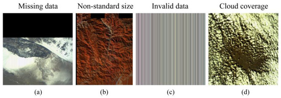 The main target of data quality assessment. (a) the GF-5 images with missing data. (b) the GF-5 images with non-standard image size. (c) the GF-5 images with invalid data. (d) the GF-5 images with cloud coverage.