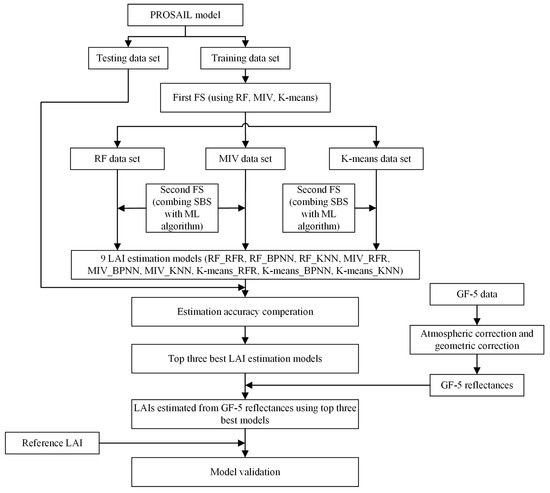 Figure 1 shows the experiment workflow of this study. Firstly, the PROSAIL model was used to generate a number of simulated data that consist of the training and testing data sets. Then, the first FS process was used to select three different subsets (RF data set, MIV data set and K-means data set), and the second FS process, which combines the sequential backward selection (SBS) process with ML regression, was conducted to select the final variables for LAI estimation. Next, the testing data set was applied to select the top three best LAI estimation models. Finally, LAI was estimated using GF-5 reflectance by the three models and evaluated using the reference LAI data.