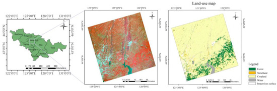 Geographic location of the study area (left: administrative map of Jilin Province; middle: standard false color image of GF-5; right: land-use map).