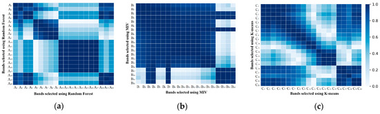 Pearson correlation coefficients between bands selected by (a) RF, (b) MIV and (c) K-means.