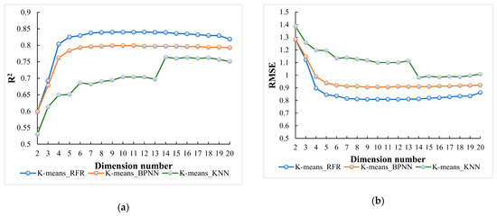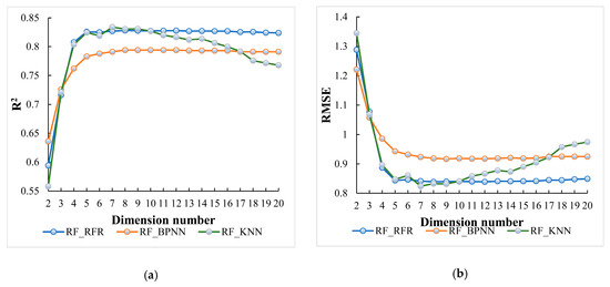 Trend of root mean square error (RMSE) values with dimension number in (a) RF_RFR model, (b) RF_KNN model, (c) RF_BPNN model, (d) MIV_RFR model, (e) MIV_KNN model, (f) MIV_BPNN model, (g) K-means_RFR model, (h) K-means_KNN model and (i) K-means_BPNN model.
