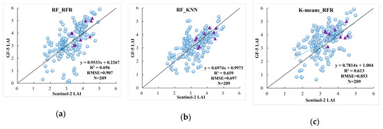 Validation of GF-5 LAI estimation based on the Sentinel-2 derived LAI (blue dots) and filed-measured LAI (purple triangle) using the (a) RF_RFR model; (b) RF_KNN model and (c) K-means_RFR.