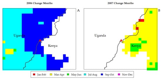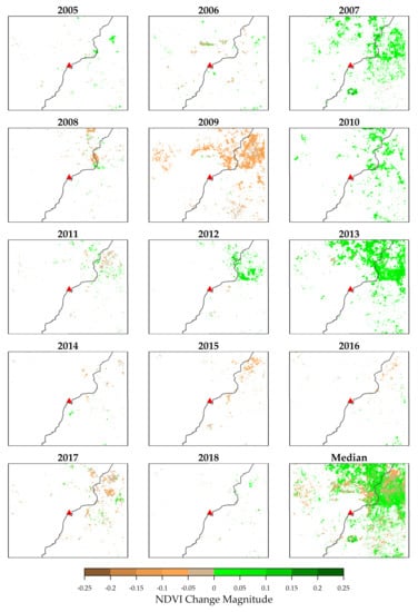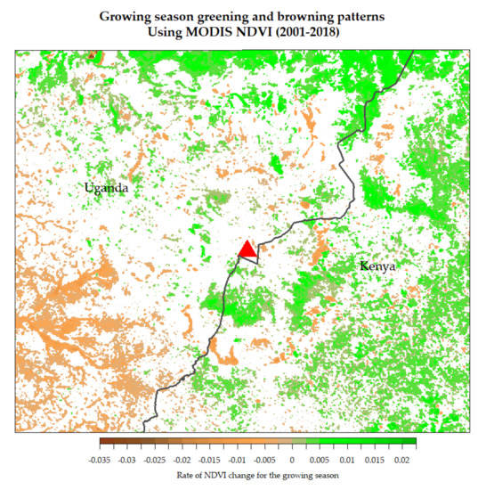 - Landmann, T.; Dubovyk, O. Spatial analysis of human-induced vegetation productivity decline over eastern Africa using a decade (2001-2011) of medium resolution MODIS time-series data. Int. J. Appl. Earth Obs. Geoinf. 2014, 33, 76–82. [Google Scholar] [CrossRef]