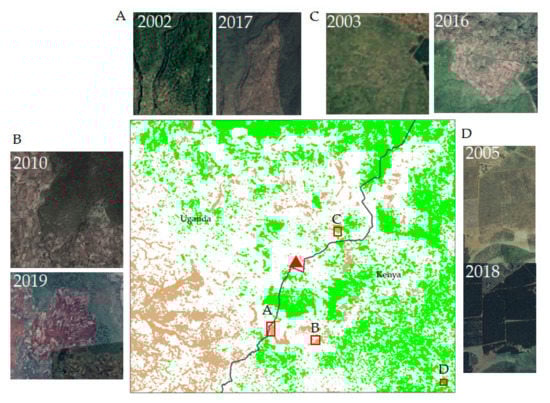 - Petursson, J.G.; Vedeld, P.; Sassen, M. An institutional analysis of deforestation processes in protected areas: The case of the transboundary Mt. Elgon, Uganda and Kenya. For. Policy Econ. 2013, 26, 22–33. [Google Scholar] [CrossRef]