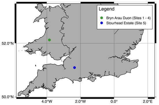 Sites 1 to 4 are forest stands located in Bryn Arau Duon, Carmarthenshire, Wales (520724.0, 35002) (Figure 1). Sites 1, 3 and 4 represent “promoting regeneration” and site 2 represents the “differentiation” stage of Schütz [] transformation stages. Bryn Arau Duon is a 600 ha Sitka Spruce (Picea sitchensis (Bong.) Carr.) dominated plantation, standing at an elevation of 400 m. The initial planting density was 2500 (stems ha−1). Stands 1 to 4 were planted between 1973 and 1980 and the first thinnings for the stands were carried out between 2002 and 2004. Since then the stands have been regularly thinned in order to progress them through transformation stages. Site 5 is located in Wiltshire, England at Stourhead Estate (510646.8, 22103). This mixed species stand is dominated by Douglas fir (Pseudotsuga menziesii (Mirb) Franco.), with the presence of other coniferous species (e.g., Picea abies (L.) Karst., Larix europea Mill.) and broadleaves species (e.g., Quercus robur L., Fraxinus excelsior L., Alnus glutinosa L. Gaertn.). Site 5 has formally been in transformation to CCF since 1997 and is the most diverse in terms of structure and tree species of the study sites and represents the “structuration” stage of Schütz [] transformation stages (Table 1).