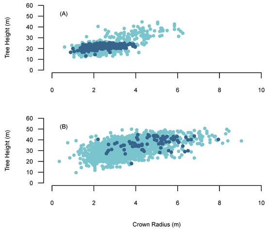 The relationship between crown radius and tree height. The light blue points are AFI tree data and the dark blue point represents reference data. (A) Sitka Spruce, (B) Douglas fir.