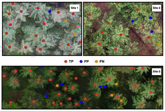 Individual tree detection from the BOVW method for Sites 1, 2 and 5. Red dots represent true positive trees (TP), blue dots represent commission (FN) and orange dots represent omission (FN).