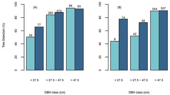 The percentage of detected trees using the Optimised Fixed Window (OFW) (Light Blue) and BOVW (Dark Blue) in diameter classes for (A) Sites 1-5 and (B) independent test site. The frequencies are located above the bars.