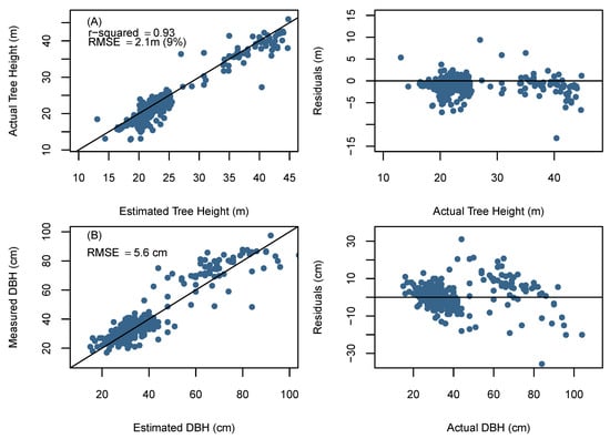 (A) Unmanned aerial vehicle (UAV) determined tree height compared to field-measured tree height; (B) UAV determined tree diameters compared to field-measured tree diameters. The solid line represents the 1:1 line the diameter RMSE is the mean RMSE across all sites.