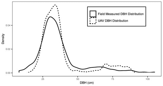 Pooled tree diameter distribution in 4 cm intervals for field measurements (line) and UAV predicted diameters (dashed line).
