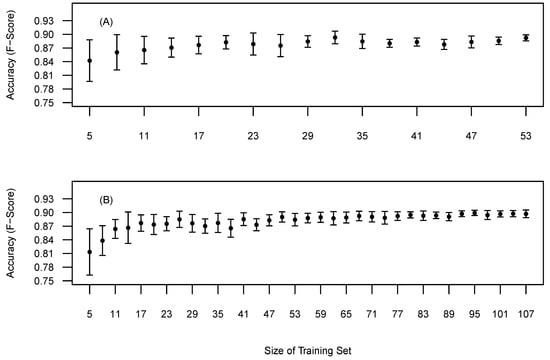 Mean tree detection accuracy based on selected training data on all reference data. (A) Site 1, (B) Site 5. Bars represent the standard deviation around the mean.