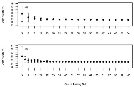 Mean tree diameter RMSE (%) based on selected training data on all reference data. (A) Site 1, (B) Site 5. Bars represent the standard deviation around the mean.